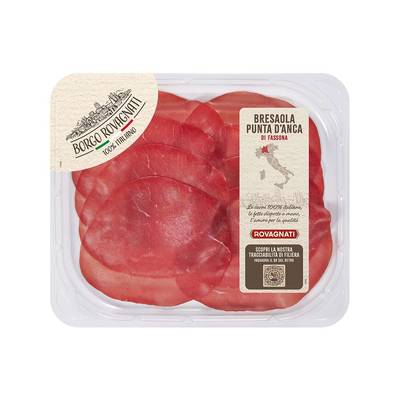 La Bresaola Punta d’Anca di Fassona Borgo Rovagnati è caratterizzata da una delicata speziatura che ne esalta il sapore intenso e deciso. Si riconosce dalla lieve marezzatura e dalla fetta, soffice e sottile, perfetta da gustare in purezza oppure condita per un pranzo leggero.