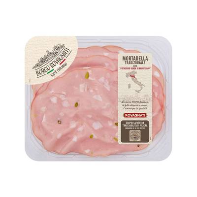 La Mortadella Borgo Rovagnati nasce da tagli di carne di suino 100% italiani, accuratamente selezionati e cotti a lungo in tradizionali forni a mattoni per preservarne la caratteristica consistenza soffice arricchita nel gusto dal pistacchio verde di Bronte DOP. Senza glutine e derivati del latte.