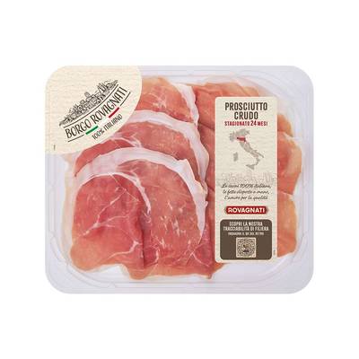 Il Prosciutto crudo Borgo Rovagnati si riconosce per la forma unica che conferisce a ogni fetta un sapore naturale e delicato. Risultato di un’accurata selezione di carni di suini nati e allevati in Italia e di una stagionatura 24 mesi, è perfetto da degustare in purezza oppure in un tagliere misto. Senza glutine.